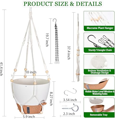 【Smart Self-Watering System】 Our hanging plant pots come with a REMOVABLE RESERVOIR TRAY that stores 7-10 day water supply. Absorbent cotton ropes automatically deliver moisture to soil when needed – ideal for vacations or busy lifestyles. Spend less time watering hanging baskets for indoor plants!