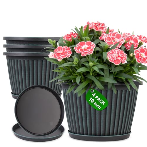 10 Inch Planter-Pots-for-Plants-Indoor-Outdoor, 4 Pack Plastic Flower Pots with Saucer & Drainage Holes, Modern Decorative Resin Garden Pots