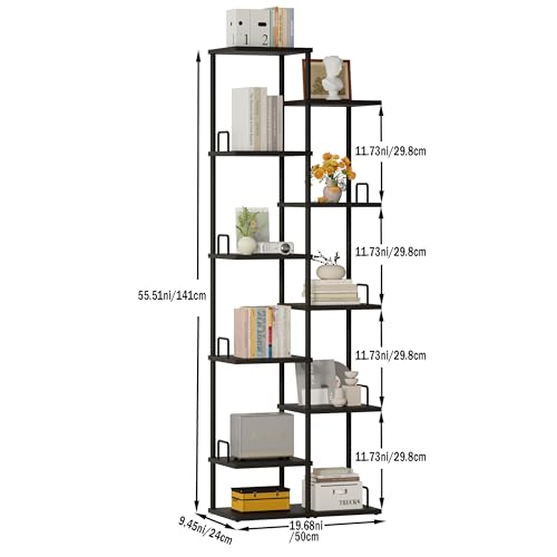 Multipurpose Use: The dimensions of this vertical bookshelf tower are 19.69 “D ×9.45” W×55.51 “H, and the size of the wooden board is 9.45” D ×10.35 “W. Not only perfect for storing books, this bookshelf can also be used for showcasing photo frames, small potted plants, decorations and more, making it a versatile addition to your home or office space.