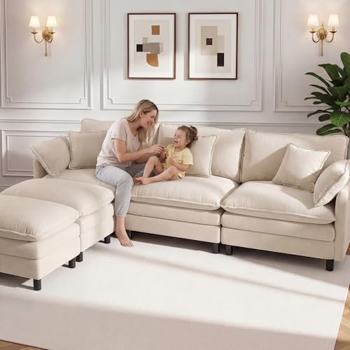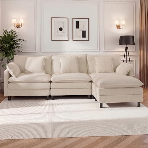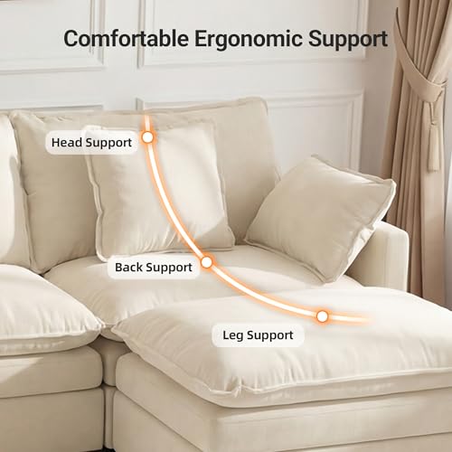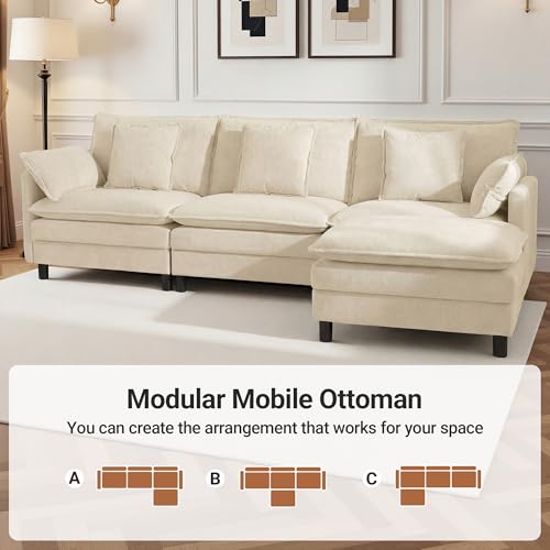110″ L-Shaped Modular Sectional Couch, Modern Cloud Couch with Ottoman, 4-Seat Chenille Sofa with Pillows, Deep Seat Comfy Couch for Living Room, Bedroom, Beige