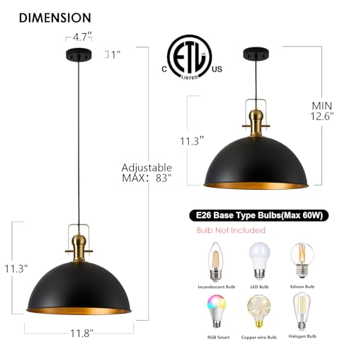 [Pendant lights for kitchen island dimension]:Hanging lamp dome shade Dia.11.8-Inch,H:11.3-Inch; Ceiling Canopy: Dia.4.7-Inch; With a 83-Inch cord, Adjustable hanging max height: 83-Inch,min heiht 12.6-inch.