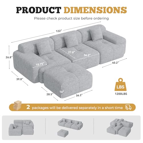 122″ Modern Boneless Couches for Living Room, Convertible L Shaped Modular Sectional Sofa,4 Seater Cloud Couch Sofa Set, Light Grey 1 PCS