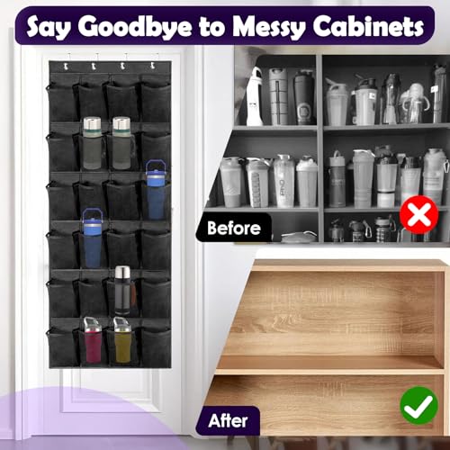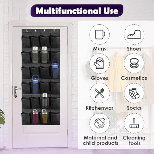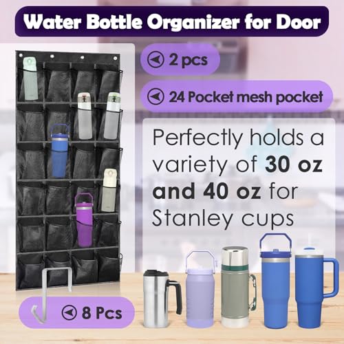 Large-capacity Storage: Our over the door tumbler organizer comes with 24 mesh pockets 5.4 x 8.3inch. Perfectly holds a variety of 30 oz and 40 oz for Stanley cups. Over door water bottle organizer for almost all household mugs. Mug storage can help you easily say goodbye to cluttered cabinets and bar.