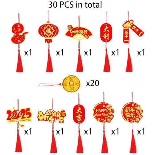 2025 Happy Chinese New Year Hanging Decorations Ornaments, 30pcs Spring Festival Lunar New Year Pendant with Red Strings, Zodiac Snake Character Hanging Decorations for Home Office Car Tree