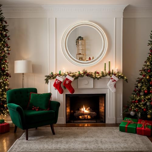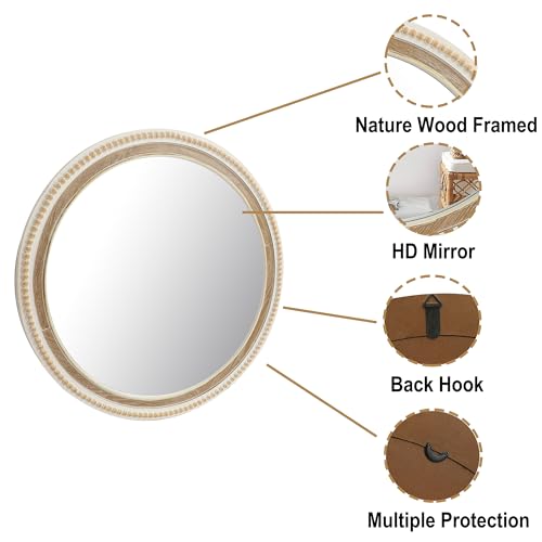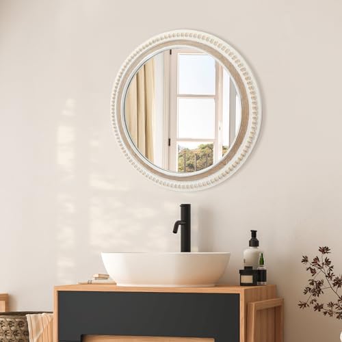 24″ Round Wall Mirror, Distressed White Wood Beaded Boho Mirror, Farmhouse Decoartive Mirror for Bedroom, Living Room, Bathroom, Entryway