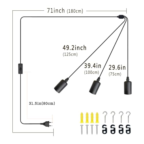 Easy Setup: 1xPack 10ft 3 bulbhanging light with pulg-in cord (The total length of the plug cord is 4.8M / 15.8ft, and the longest cord is 10ft.) allows for easy installation and operation with no electrical expertise required.