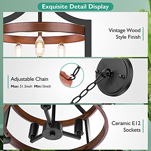 3-Light Rustic Farmhouse Pendant Hanging Light Adjustable Height Max 68in, Convertible Vintage Semi Flush Mount Ceiling Light Fixture Black Metal Chandelier Walnut Wood Finish for Kitchen Dining Room