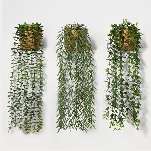 3 Pack Artificial Hanging Plants in Boho Handwoven Baskets for Living Room, Bedroom, Bathroom Wall Shelf Decor