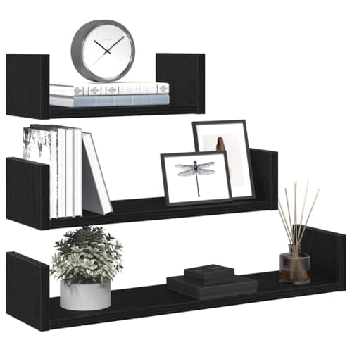 3-Piece Floating Black Oak Wall Shelf Set, Modern Wooden Storage Shelves for Living Room, Bedroom, Kitchen | Heavy Duty Engineered Wood, Invisible Mounting, Easy to Clean,