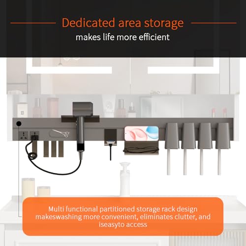 【Built in multifunctional partitioned storage rack】:Features 2xOutlets + Multiple types of hooks. Safely charge toothbrushes, razors, or hair tools without dangling cords.