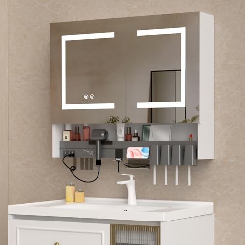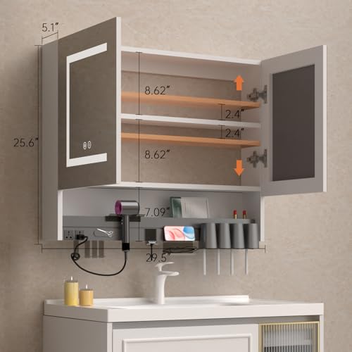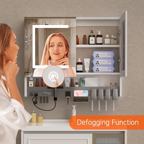 30 inch LED Medicine Cabinet with Defogging Mirror, Adjustable Brightness & Color Temperature, Built in Multifunctional partitioned Storage Rack, Bathroom Mirrors for Over Sink with Storage