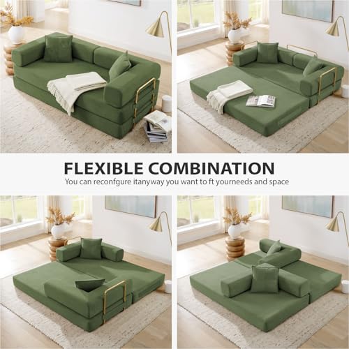 4-in-1 Folding Convertible Sofa Bed, 78 Inch Oversized Corduroy Upholstered Boneless Couch, Loveseat Sleeper with Pull Out Bed, Floor Sofa Modular Futon Couch for Living Room Bedroom Lounge, Green