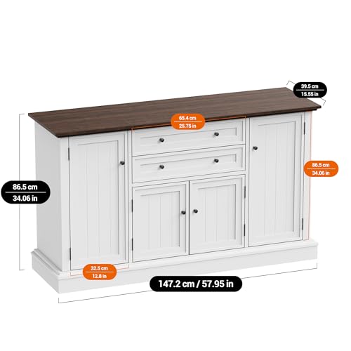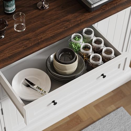 【Storage Aplenty】This Farmhouse Buffet Sideboard comes with 2 large drawers on the top that allow you to organize your household items efficiently. The wide tabletop can hold your decorative items, and there are a total of 4 cabinet doors on the bottom and sides to store your food, pots and pans, spices or personal items.