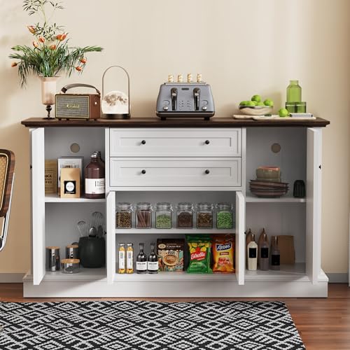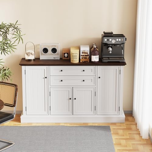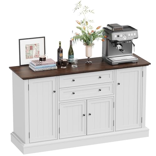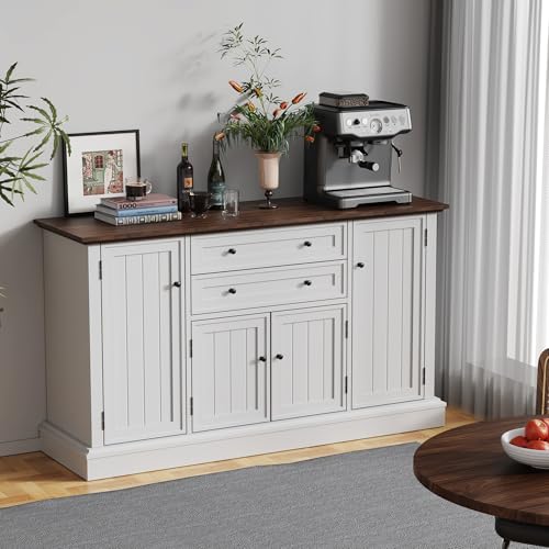 58″ Buffet Sideboard Cabinet with Storage, Modern Farmhouse Coffee Bar Cabinet with Drawers and Doors, Wood Coffee Bar for Kitchen, Living Room, White