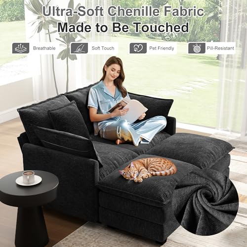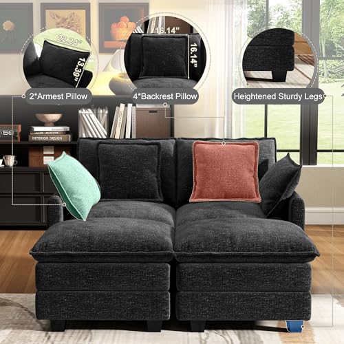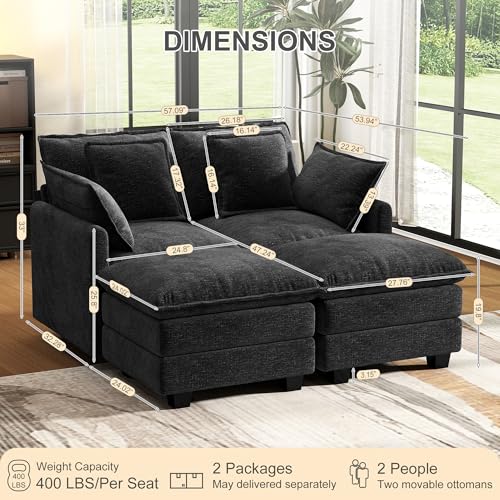 58″ Cloud Couch Loveseat, Deep Seat Modular Sectional Sofa with 4 Removable Washable Pillows and 2 Ottoman for Living Room, Bedroom, Apartment, Black
