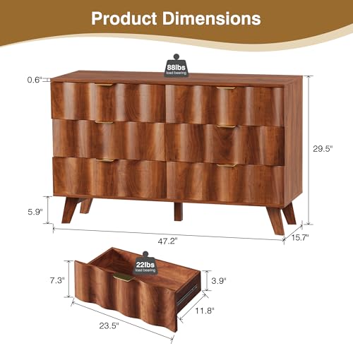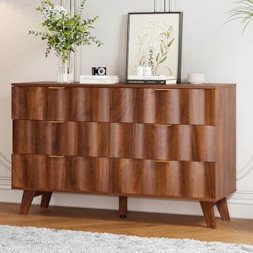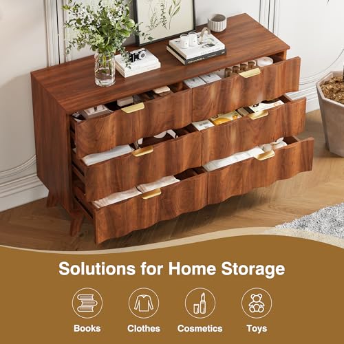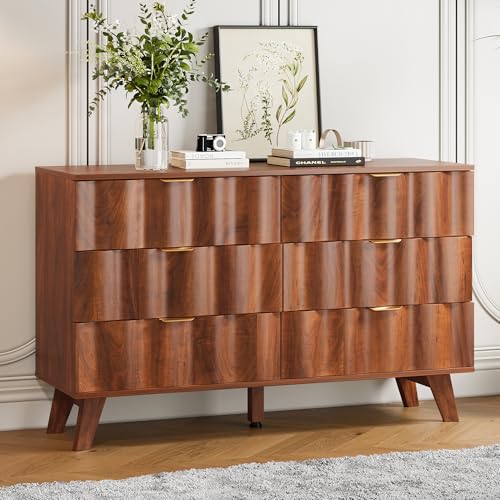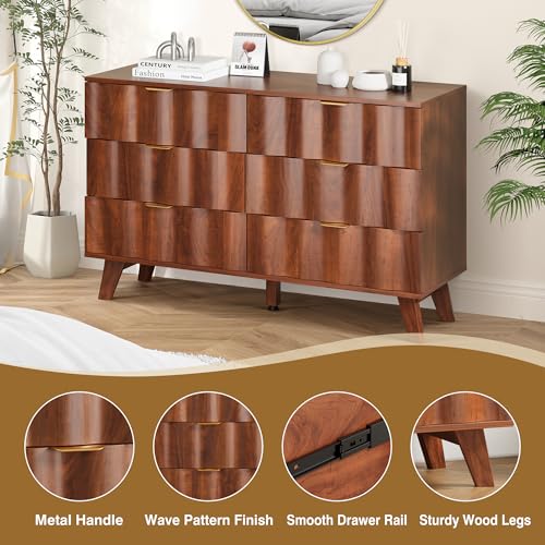 6 Drawer Dresser, Modern Fluted Storage Dresser with Deep Drawers and Metal Handles, Wood Chest of Drawers Storage Organizer for Bedroom, Living Room, Hallway (Walnut)