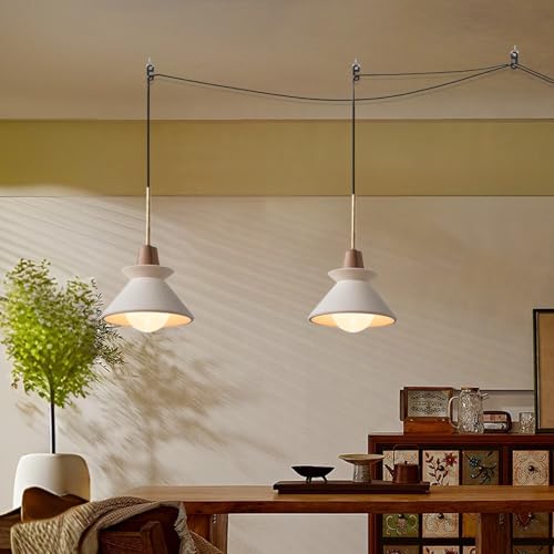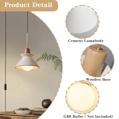 7.7″ Plug in Concrete Pendant Light, Nordic Wabi Sabi Pendant Lamp with Wood Accent White Cement Pendant Light Minimalist Lamp for Living Room Bedside Kitchen Island Dining Room Apartment Dorm