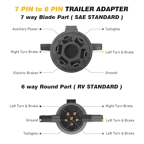 STANDARD AND TIGHT CONNECTIONS: This 6-way to 7-way trailer adapter can be connected to any standard 7 way RV blade. The surface of the plug is specifically designed to lock the plug in place. It is utilized to connect taillights, brake lights, turn signals, trailer brakes and auxiliary power sources.