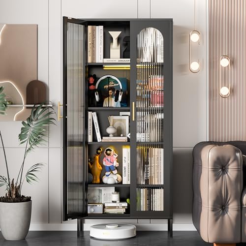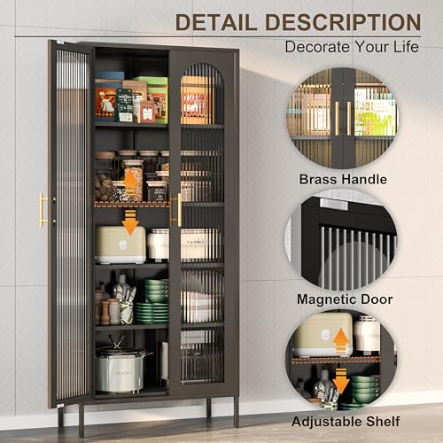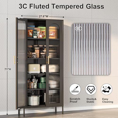 Adjustable Cabinets: The black display cabinet with glass doors comes with adjustable shelves and feet, you can easily customize the layout to fit your items and ensure stability on any surface.Whether storing spices, kitchenware, small appliances, books or displaying collectibles. This stylish fluted glass cabinet is ideal.