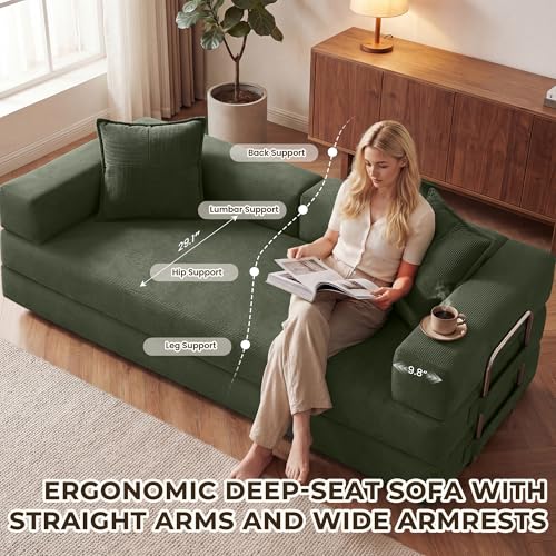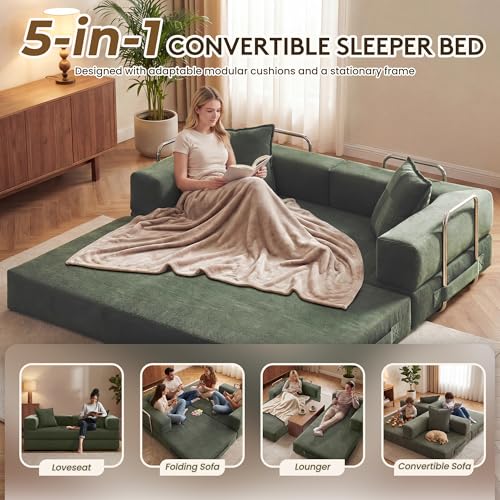 78 Inch Convertible Sofa Bed, 5-in-1 Futon Sofa Bed Pull Out Couch, Boneless Couch Bed for Living Room, Corduroy Boneless Couches for Bedroom, Apartment, No Assembly Sleeper Sofa Bed, Green | 4 Fixed-Shape Frame, Removable Corduroy, High-density foam, with 2 pillow, Tool-Free Assembly