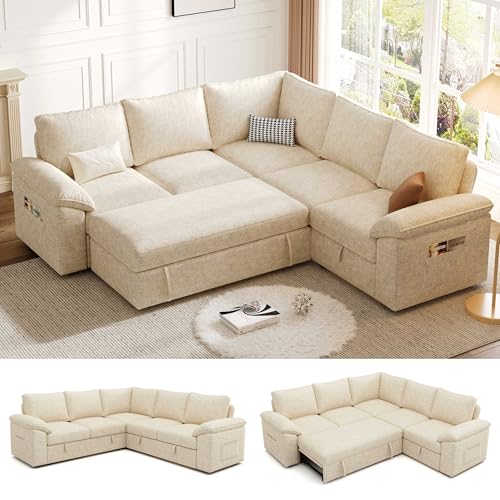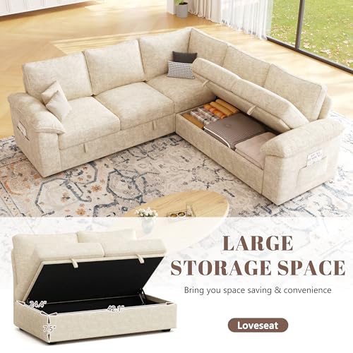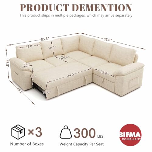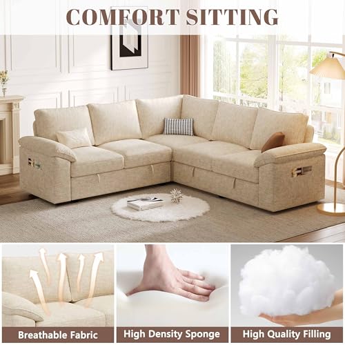 85 Inch Modular Sectional Sofa with Pull Out Bed, L Shaped 5 Seat Sectional Sleeper Sofa with Storage, Sectional Couches for Living Room, Cloud Modular Couch, Removable Sofa Cover, Beige