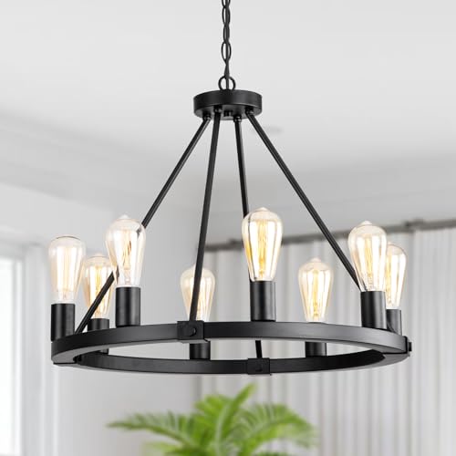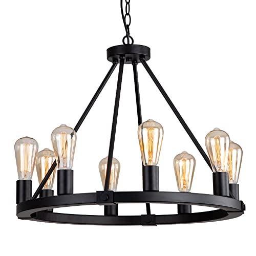 9MMML 23.6″ 8 Lights Wagon Wheel Chandelier,Black Metal Round Industrial Vintage Kitchen Island Pendant Light for Living Dining Room Foyer Entryway,Height Adjustable,E26.