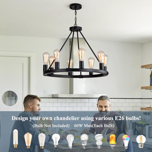 Farmhouse And Industrial Design: Wagon Wheel Chandelier use quality and durable Matte Black Metal body and 8 Lights E26 base,offers enough lights for your decor space. Creating warm vintage relaxing atmosphere.