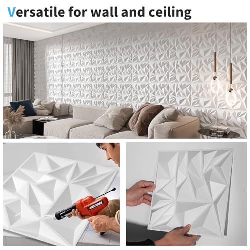 Art3d 33-Pack 3D Wall Panels for Interior Wall Decor, Modern Diamond Textured Accent Wall Paneling for Gaming Living Room TV Wall Background, 12 x 12 inch White, A10342
