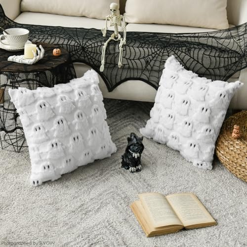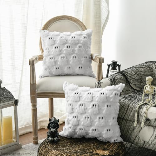 AVOIN colorlife Halloween Ghost White Throw Pillow Cover Set of 2, 18 x 18 Inch Soft Plush Faux Fur Jacquard Spooky Cushion Case Decoration for Sofa Couch
