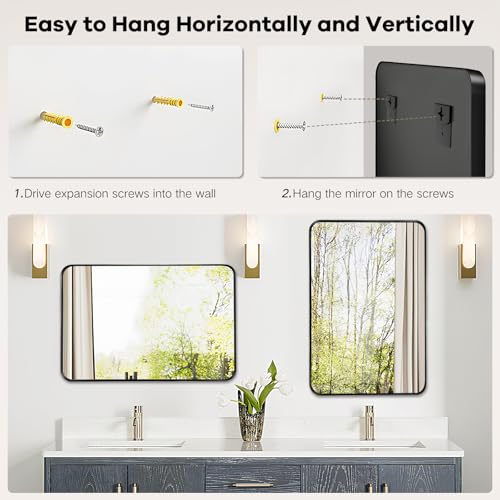 Simple Installation & Shatter-proof Glass – The installation of bathroom mirrors is easy, which can be done in 2 steps according to the instructions, and you can hang on the framed mirror vertically or horizontally. The glass is made of nano glass, which is not easy to shatter and no distortion when use