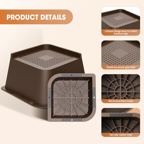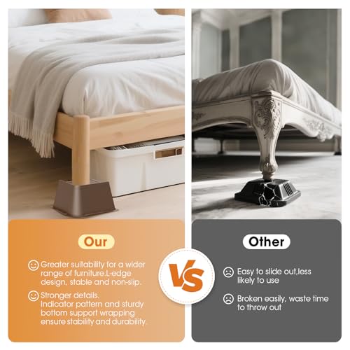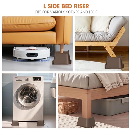 Half Side Design; the L shaped bed risers raised edge allowing you to slide bed risers under the legs easily; 2 side raised edge also makes the risers to easier to match different furniture legs.