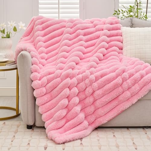 BEDELITE Faux Fur Throw Blanket for Couch, Soft and Cozy Luxurious 3D Striped Fluffy Blanket, 770GSM Thick Warm Plush Fuzzy Faux Rabbit Fur Blanket for Women Gift (Cream, 50″x 60″)