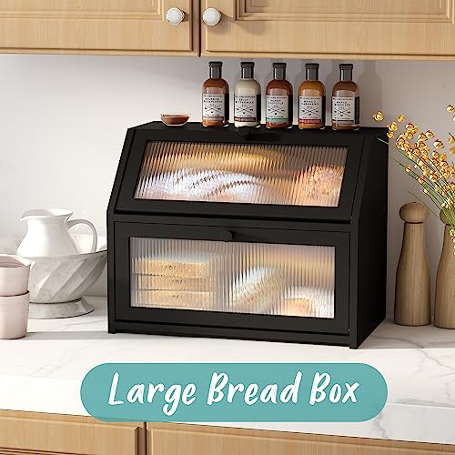 Black Bread Box for Kitchen Counter, Large Bamboo Wood Double Layer Bread Box, Wooden Bread Storage Capacity