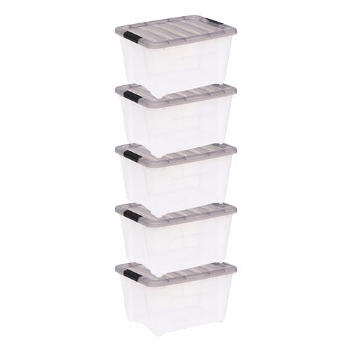 Clear Plastic Storage Bins with Gray Lids, 19 Qt Stackable Container Box, Built-in Handles, 15.38×12.38×9.63 Inches, Set of 5