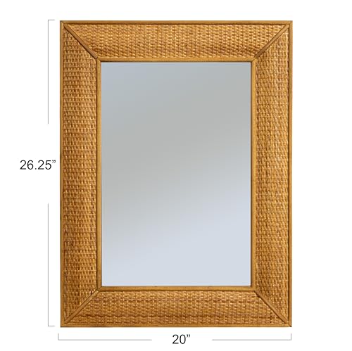 This rectangle wood framed wall mirror with rattan detail brings some coastal charm and warmth to the space. This mirror features a wood frame and an intricately woven rattan detail in a brown finish that adds a touch of texture and character to the decor. The mirror is made of glass, firwood, and rattan for a durable and organic look. The mirror includes a sawtooth hanger for easy mounting and can be hung horizontally or vertically. This mirror is ideal for adding a touch of coastal charm and warmth to the living room, bedroom, or bathroom. It measures 20 inches wide by 26.25 inches high, making it a perfect size for any space. This mirror is a stunning piece that will add a touch of sophistication to any home.