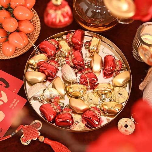 DecorbyHannah Chinese Lunar New Year Decorations 2026, 18ct Red and Gold Christmas Ornaments for Small Tree with Lucky Bags, Copper Coins, Gold Ingots,Shatterproof Mini Balls for Party, Home Decor