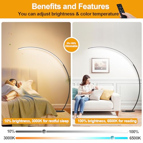 Dimmable LED Lamps for Living Room with 3 Color Temperatures, Ultra Bright 2000LM Arc Floor Lamps, Modern Standing Tall Lamp with Remote Control Reading Floor Lamp for Bedroom Office Classroom