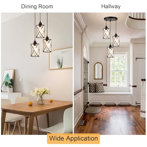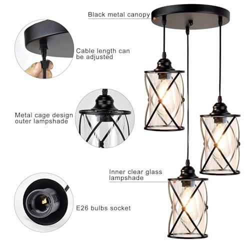 DLLT 3-Light Industrial Pendant Light, Black Metal Cage Hanging Chandelier Lights with Glass Shade, Vintage Style Flush Mount Swag Lighting Fixture for Kitchen/Dining Room/Hallway/Bedroom, E26 Base