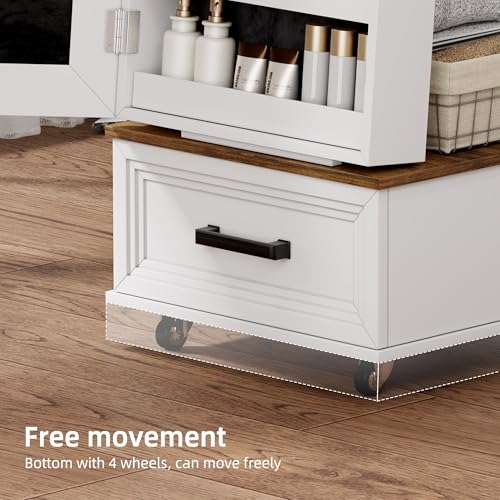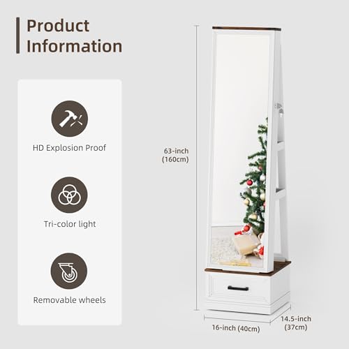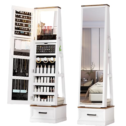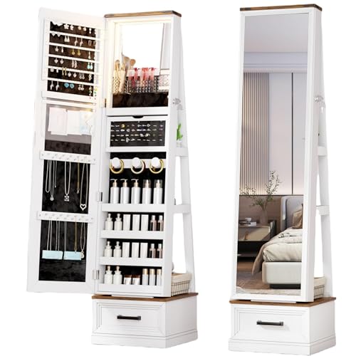 FONTOI Jewelry Armoire, Mirror Jewelry Cabinet Standing with Drawers and Wheels, 63″ Lockable Jewelry Cabinet with 4 Shelves, 360° Rotating Full Length Mirror with Storage for Checkroom Bedroom White
