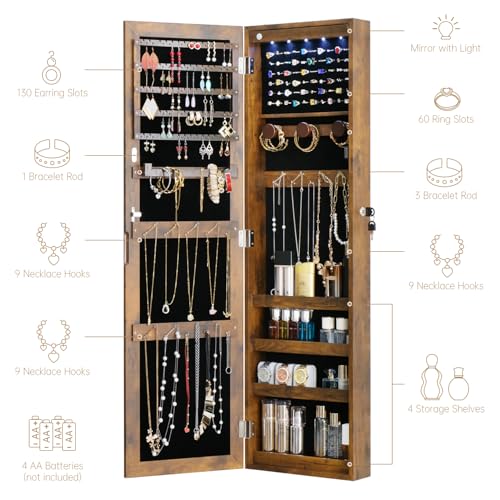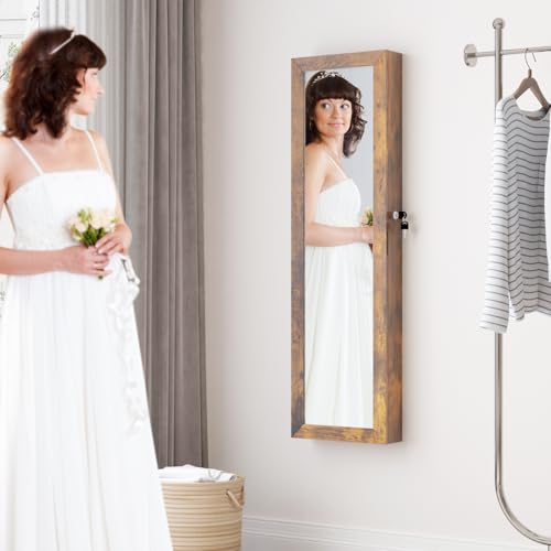 Full Length Mirror Jewelry Cabinet Organizer Lockable Door Wall-Mounted Jewelry Armoire with Shelves and Behind the Door Storage Rustic Brown