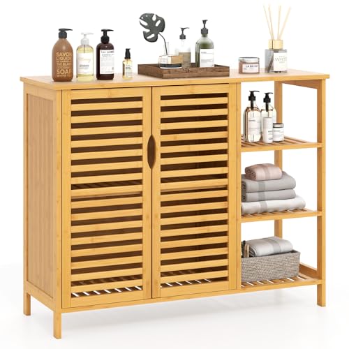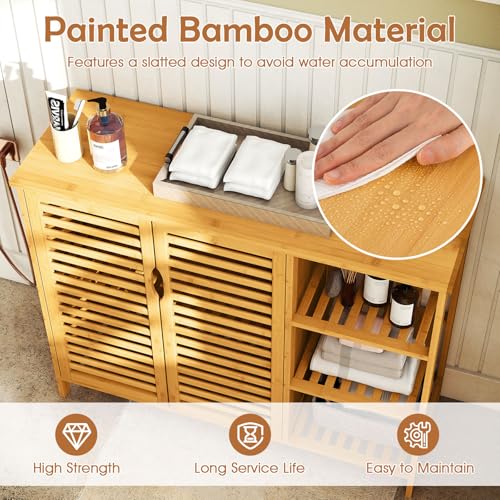 Giantex Bamboo Bathroom Storage Cabinet, 2-Door Storage Organizer with Shelves, Freestanding Floor Cabinet, Slatted Bamboo Home Furniture for Living Room Entryway Kitchen Dining Room, Natural