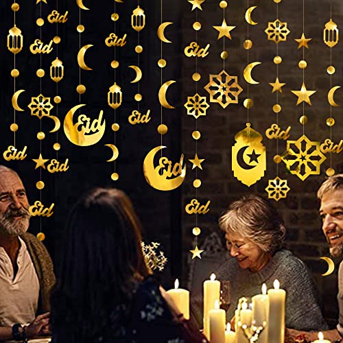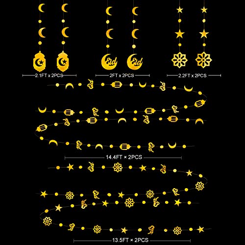 Package Includes – 2 strings of 14.4 ft gold moon circle dot Eid sign Arabic lantern garland,2 strings of 13.5 ft gold star dot Eid sign paper cut flower garland,2pcs of 2ft crescent moon eid sign hanging cutout garland,2pcs of 2.2ft eid star circle dot flower cutout garland,2pcs of 2.1ft eid star moon lantern cutout garland.