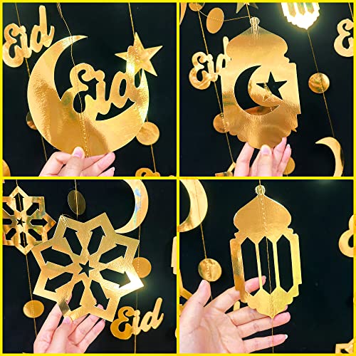 Gold Ramadan Decoration Eid Mubarak Star Moon Circle Dot Arabic Crescent Lantern Hanging Paper Garland Streamer Backdrop Banner for Islam Muslim Lesser Bairam Ramadan Kareem Eid Al Adha Party Supplies