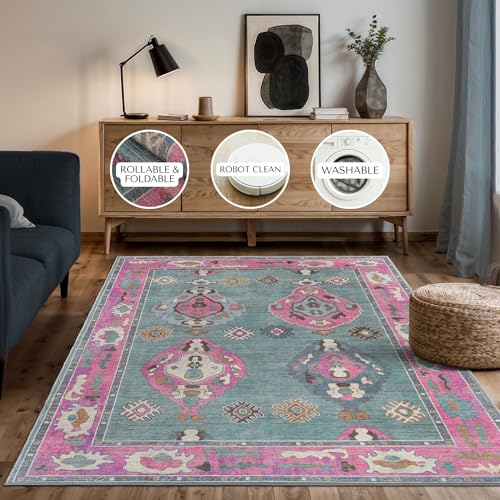 Green Pink Boho Oushak Rug 2×3 – Vintage Turkish Small Area Rugs for Kitchen Floor, Non-Slip Washable Rugs for Entryway, Entrance, Bathroom, Bedroom, Under Table, Living Room, Indoor