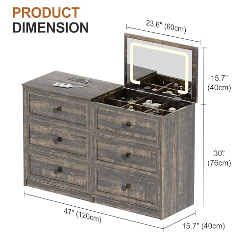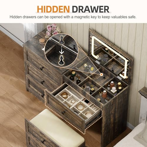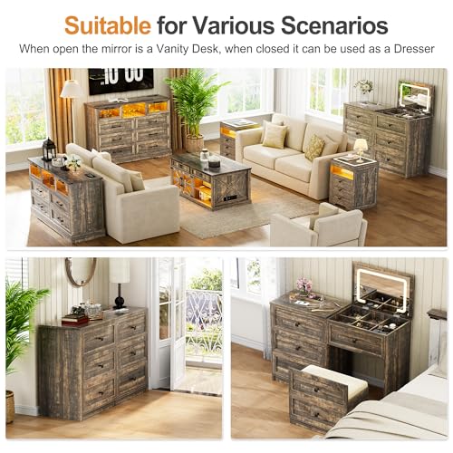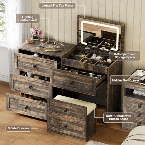 Gurexl 3-in-1 Vanity Desk with Flip Top Mirror and Lights, Makeup Dressing Table with Gun Drawer and Charging Station, Bedroom Dresser Vanity with Chair and Hidden Storage (Dark Rustic Oak)