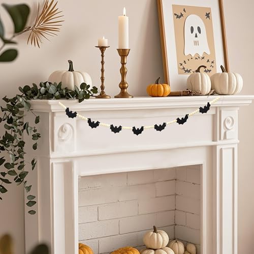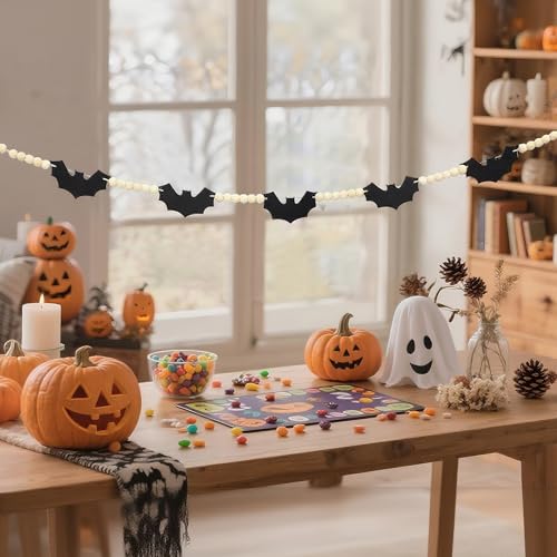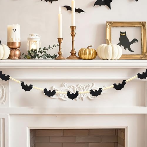 Halloween Decorations Indoor-Black Felt Bats Wood Beads Garland for Halloween Decors- Farmhouse Felt Banner for Fireplace Mantel Walls
