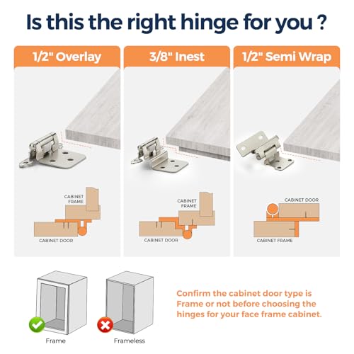 Face Frame Design: These hinges are specifically designed for face frame cabinets. Before purchasing, we recommend checking your existing cabinet hinges to ensure compatibility