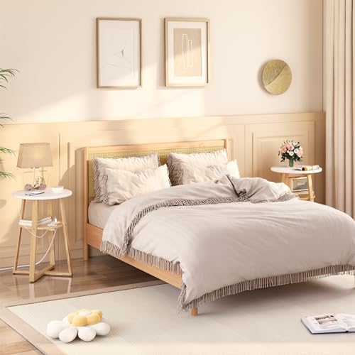 HOOBRO Round Side Table with Charging Station, Round Accent End Table with Bamboo Legs for Living Room, Bedroom, White and Natural YW101UBZ01
