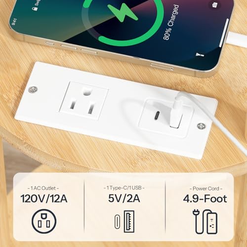 Handy Charging Station: The side table features a charging station with an AC outlet, a USB-A port, and a Type-C port with a 4.9-foot-long power cord for you to conveniently charge devices like phones, headphones, and lamps by your bed or couch, offering both convenience and flexibility
