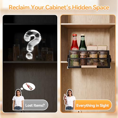 【Beyond the Kitchen: Organize Any High Cabinet】Designed to solve your kitchen’s high cabinet struggle, but its usefulness doesn’t stop there. Mount it anywhere with a door and depth: the bathroom for daily toiletries, the pantry for snack overflow, the garage for small hardware, or the closet for accessories. Wherever you have a cabinet and small items that play hide-and-seek, this pull-down shelf brings them to light